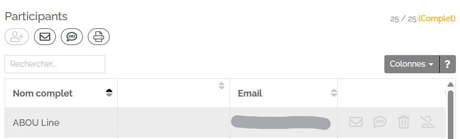 Actions groupées : Utilisez les icônes à côté du bouton d'ajout pour envoyer un Email, un SMS à tous les inscrits, ou pour Imprimer votre liste d'émargement.